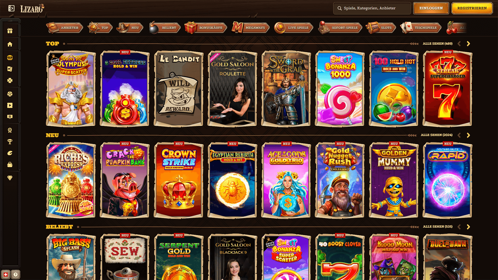 La colección de tragamonedas Lizaro ofrece más de 10 000 títulos de videojuegos gracias a su colaboración con más de 100 operadores, como Pragmatic Play, Spinomenal, Play ‘n GO y Novomatic. Los juegos se dividen en categorías como los mejores videojuegos, Nuevos lanzamientos, compras de beneficios y Megaways. Lizaro añade nuevos títulos regularmente y los muestra claramente para facilitar su reconocimiento. La lista de las tragamonedas favoritas de Lizaro se encuentra a continuación: